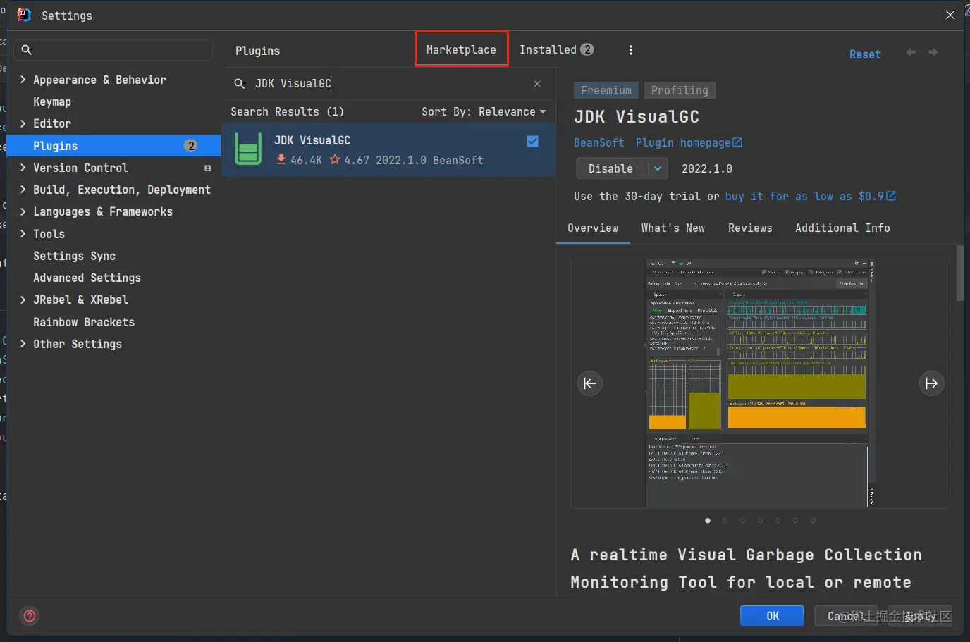 - Plugins 在其中搜索 JDK VisualGC,搜索结果如下所示: