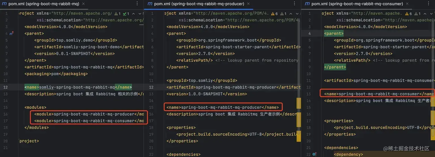 使用maven多模块,将生产者、消费者分别以springboot项目启动,两者通过RabbitMQ进行消息通信。