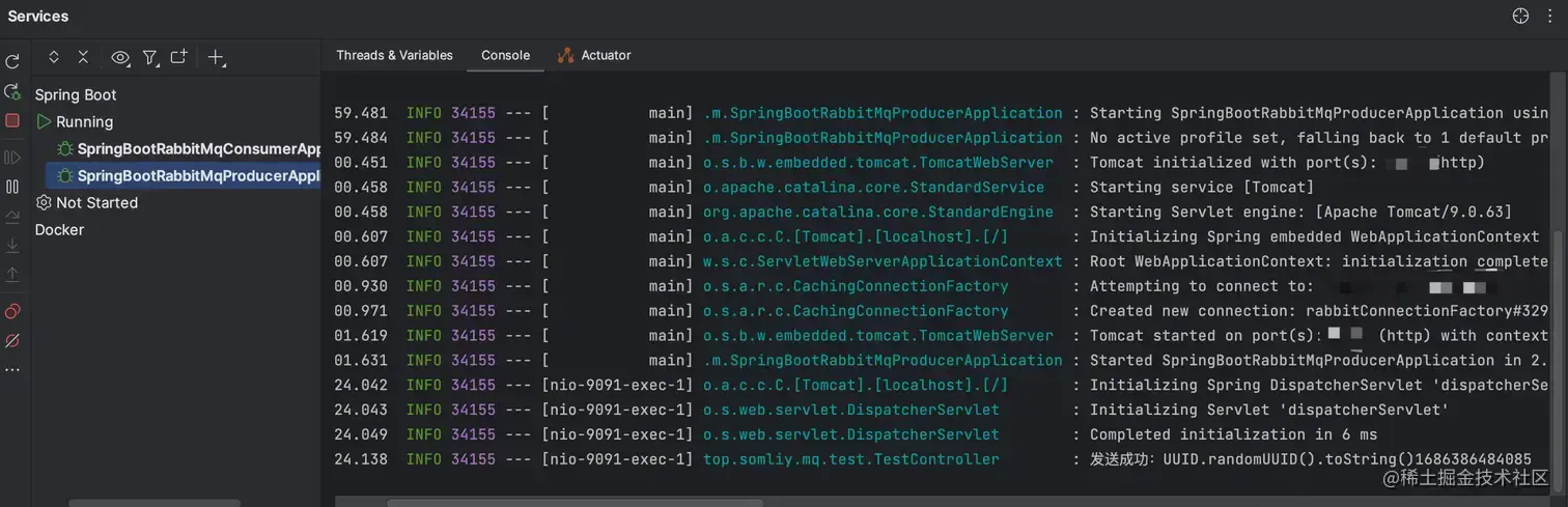 - 启动生产者SpringBootRabbitMqProducerApplication.java