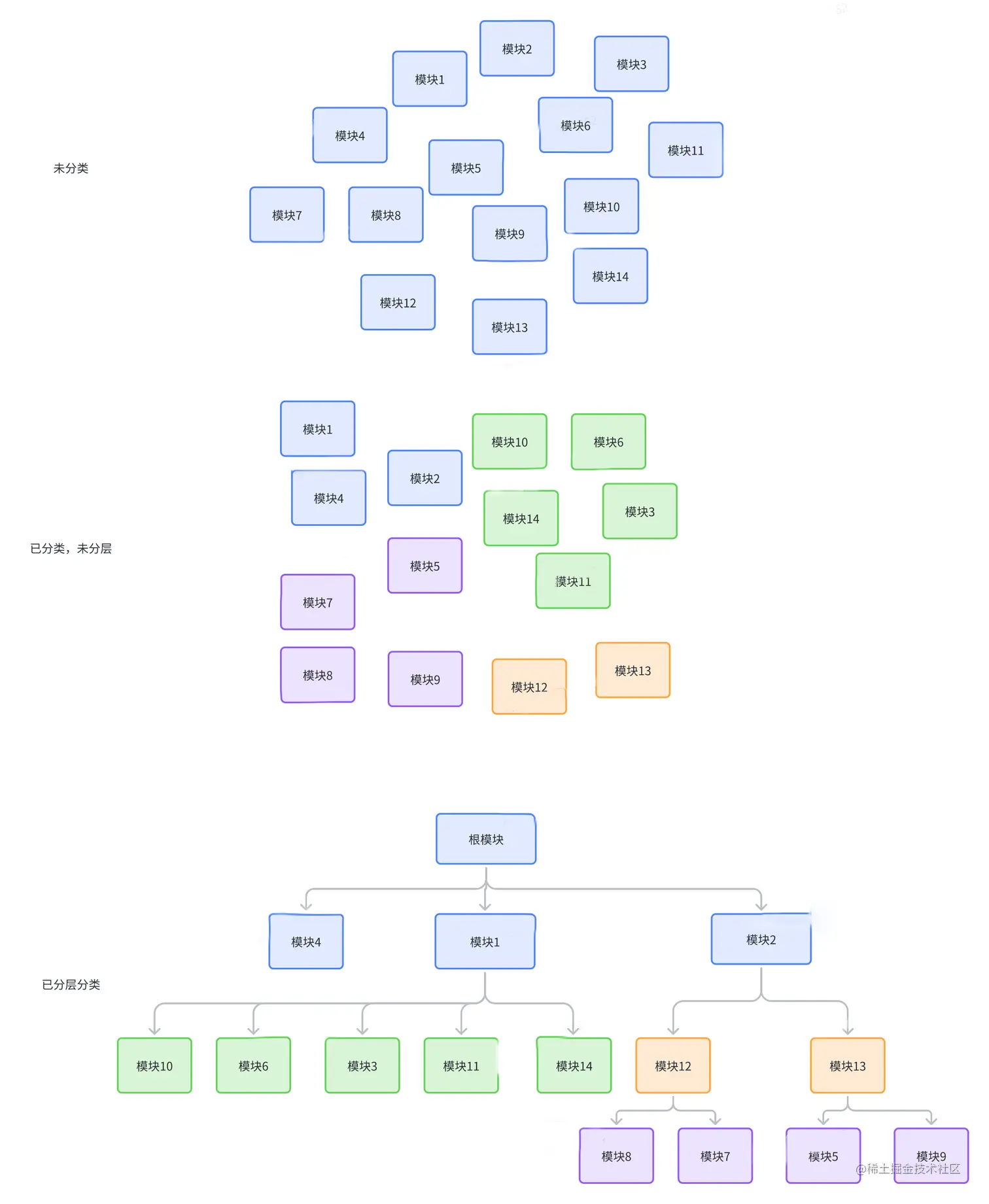 总而言之,设计人员对模块进行分层分类后,可以大大降低思考复杂度, 这个很好理解。