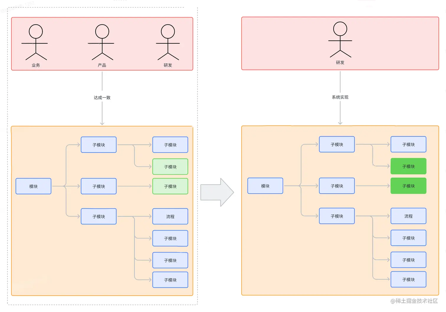 | 左边图描述的是:业务、产品、研发对齐需求后,认为的业务系统上需要建设两个子模块的能力。 |
