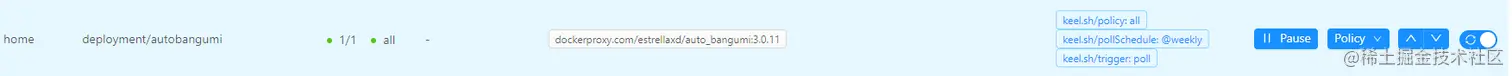 部署完 Keel 后,访问服务器的 9300 端口,输入部署中设置的用户名和密码,打开 Keel 的设置界面,在首页中可以看到我部署的 autobangumi 服务,打开行尾的更新开关,autobangumi 会出现 keel.sh/policy: all keel.sh/trigger: poll keel.sh/pollSchedule: @every 1m 表示 Keel 每隔 1 分钟会通过轮询一次 autobangumi 镜像的版本是否有更新,当有新版本更新时,全部都会触发更新。