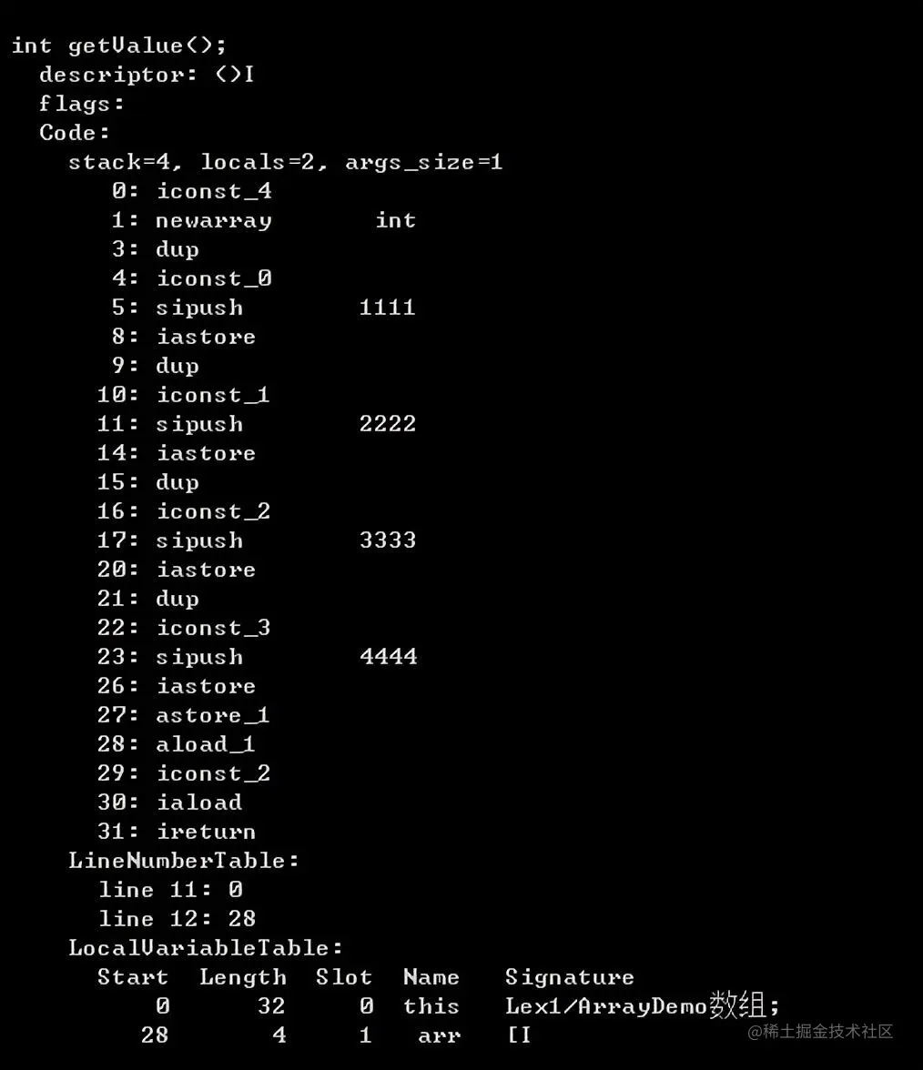 可以看到,新建数组的代码,被编译成了newarray指令。(每当遇见new指令后,都会跟一个dup指令)。