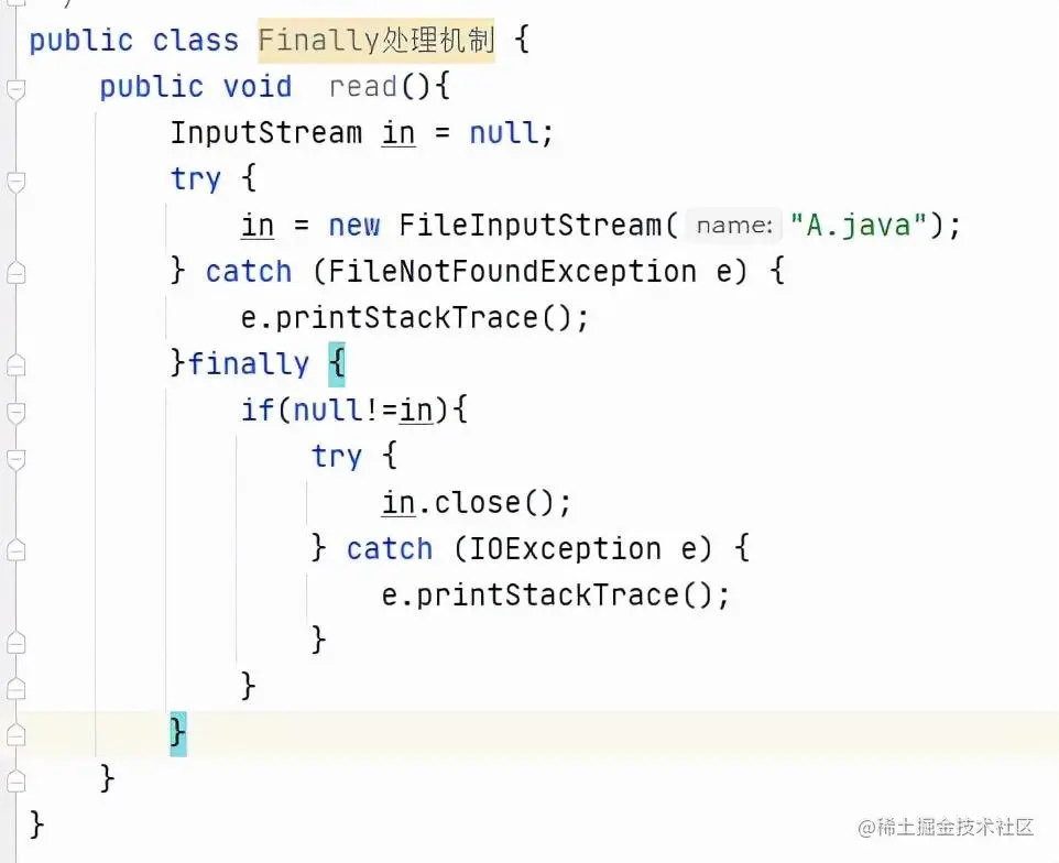 通常我们在做一些文件读取的时候,都会在finally代码块中关闭流,以避免内存溢出。关于这个场景,我们再分析一下下面这段代码的异常表