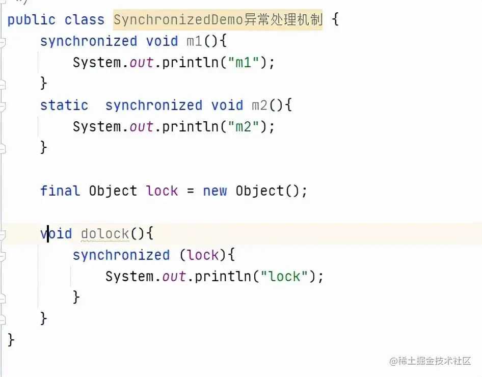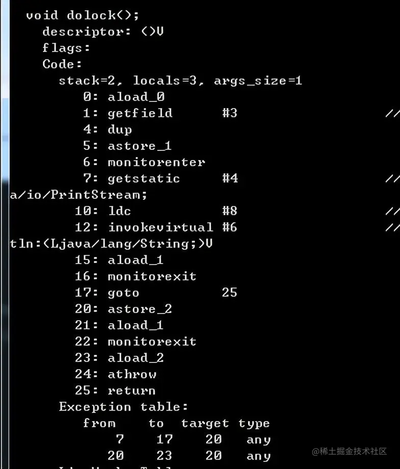 在synchronized生成的字节码中,其中包含了两条monitorexit指令,是为了保证所有的异常条件都能够退出。可以看到,编译后的字节码,都带有一个叫Exception table的异常表,里面每一行数据,都是一个异常处理器。