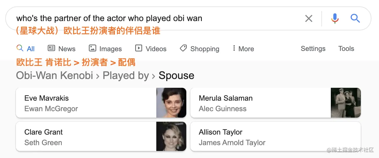 如前所述,我们的查询通常与所需内容的确切词组不匹配。 知道“负担得起”是介于便宜,中档和合理价格之间的任何事物,这一点至关重要。在此示例中,实体是电影和连续剧中的角色(欧比王),具有特定工作的人(演员)以及与之相关联的人(伴侣)。 通常,实体是可以明确识别的对象或概念-通常是人,地点和事物。