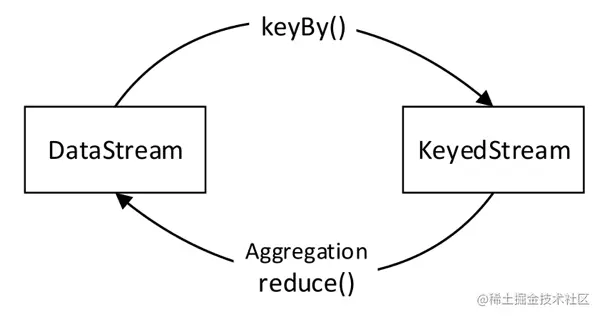 aggregation:aggregation是聚合算子,类似的还有:reduce、sum、max、min。Aggregation算子作用于KeyedStream上,并且进行滚动聚合。与keyBy()算子类似,可以使用数字或字段名称指定需要聚合的字段。keyBy()算子会将DataStream转换为KeyedStream,而Aggregation算子会将KeyedStream转换为DataStream,类似下图: