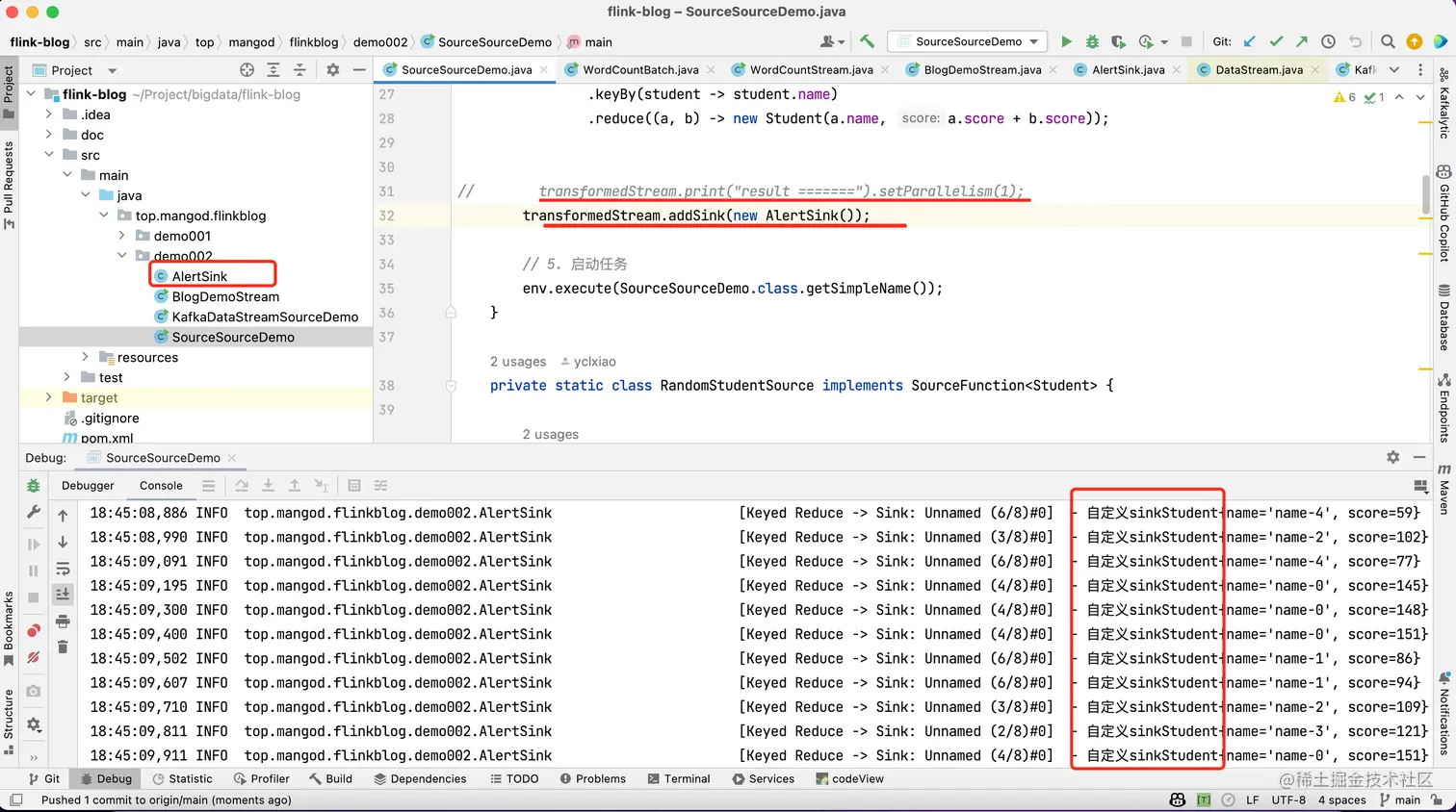 自定义Sink只需要实现SinkFunction,例如上面的例子中(随机生成学生分数),现在是直接print出来信息,改造成自定义Sink的方式之后,代码如下: