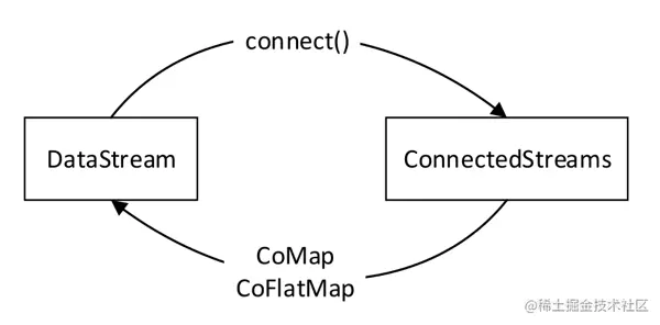 union()的执行结果是DataStream,而connect()的执行结果是ConnectedStreams;ConnectedStreams表示两个(可能)不同数据类型的连接流,可以对两个流的数据应用不同的处理方法,当一个流上的操作直接影响另一个流上的操作时,连接流非常有用。可以通过流之间的共享状态对两个流进行操作。