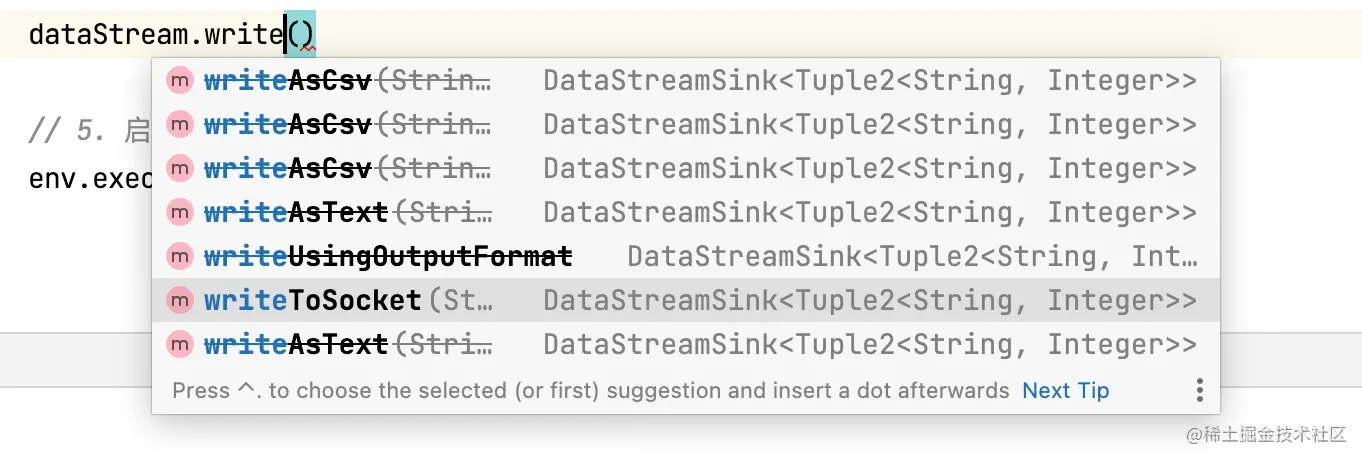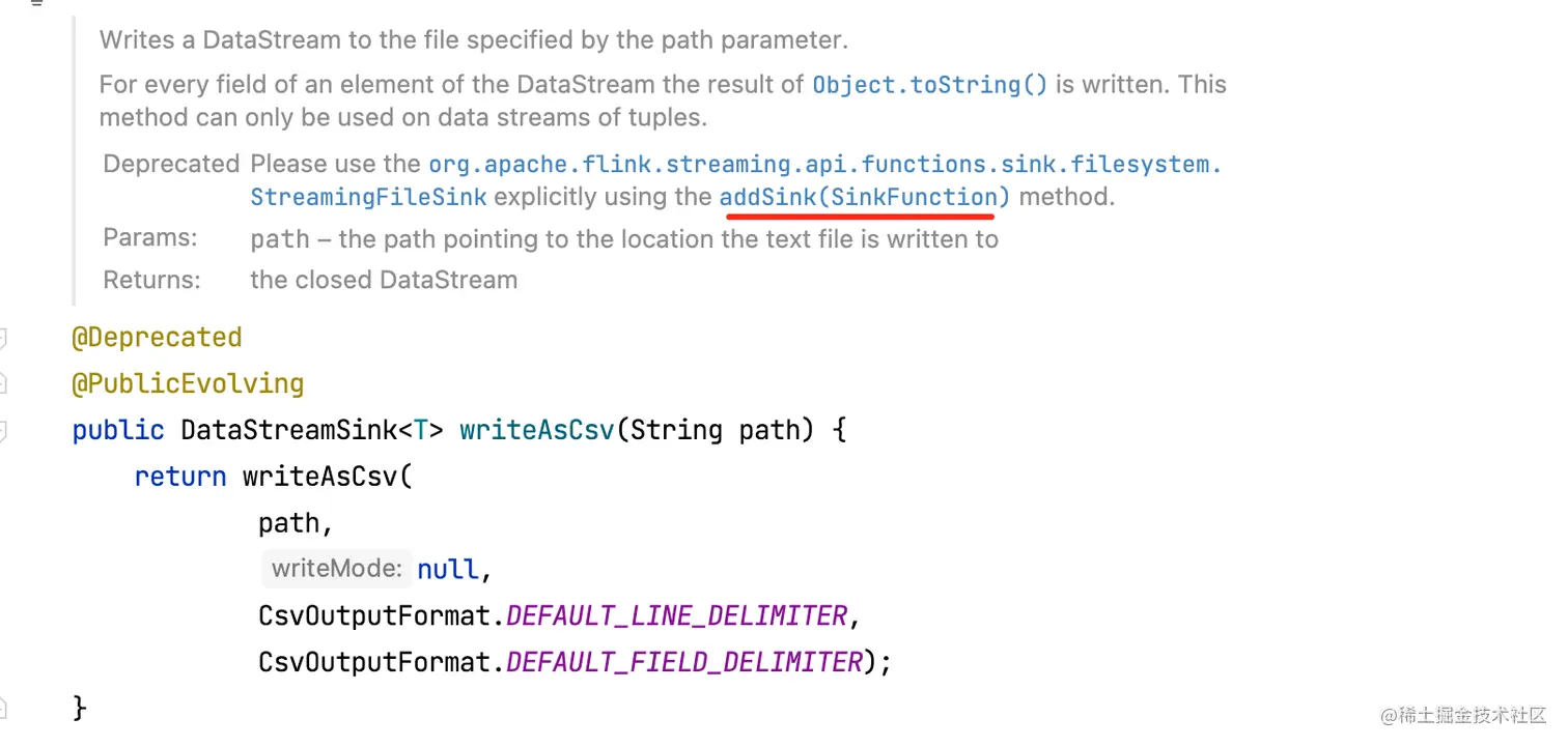 Flink可以使用DataStream API将数据流输出到文件、Socket、外部系统等。Flink自带了各种内置的输出格式,比如writeAsText()、writeAsCsv()等,但是已经过时,如下: