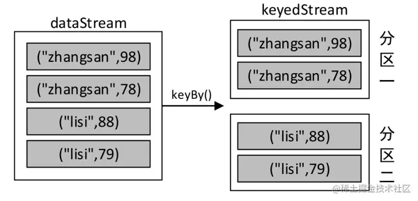 keyBy:keyBy()算子主要作用于元素类型是元组或数组的DataStream上。使用该算子可以将DataStream中的元素按照指定的key(指定的字段)进行分组,具有相同key的元素将进入同一个分区中(不进行聚合),并且不改变原来元素的数据结构。