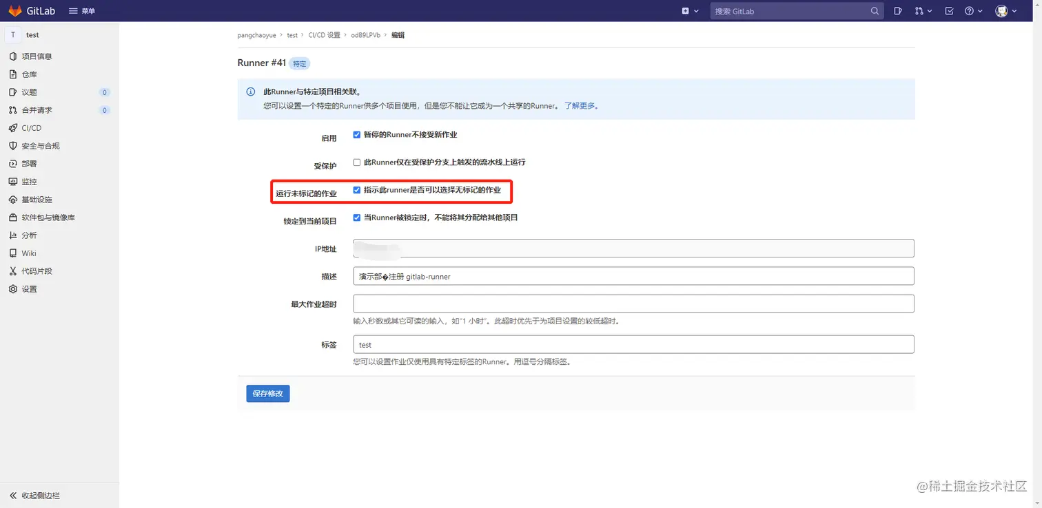 如果不选中 运行未标记的作业, CI/CD 任务会一直被阻塞挂起