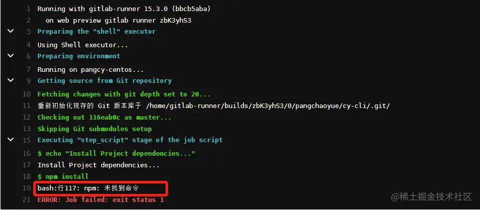 这是因为所使用的命令在 runner 服务器上不存在,如:java , node , npm , maven 等