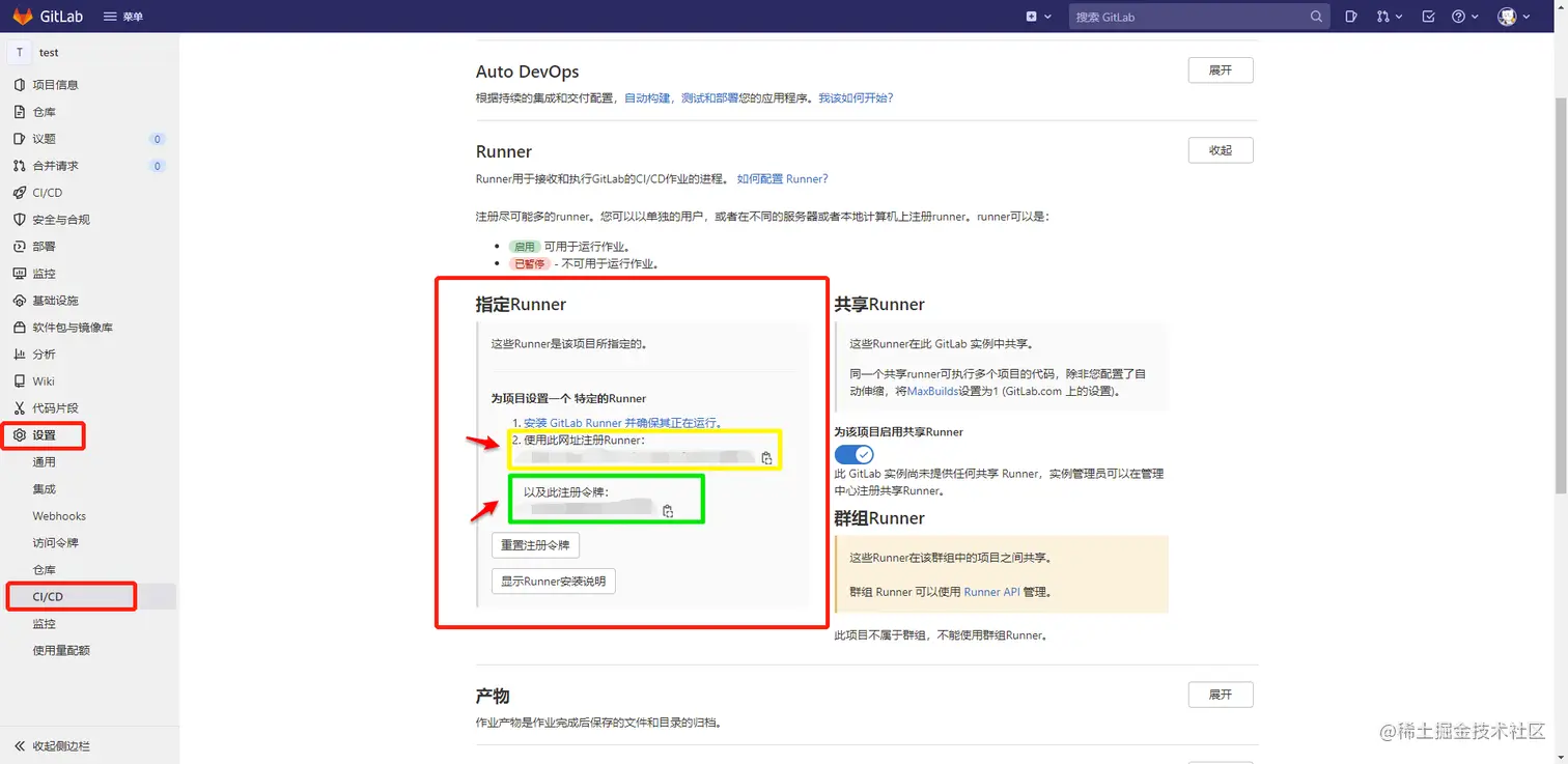 进入 设置 - CI/CD -Runner : 拿到 URL 和 token