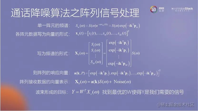阵列算法主要用于实现方向性的信号抑制,其中包括一些常见的算法,如GSC、MVDR、GEV等。这些算法的主要目标是求出麦克风阵列与声源方向之间的关系。具体的推导过程可以在相关资料中找到。