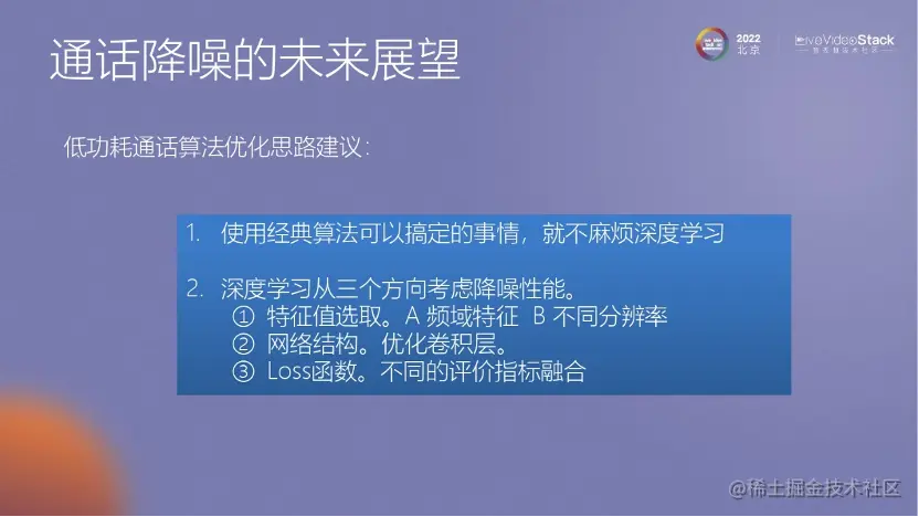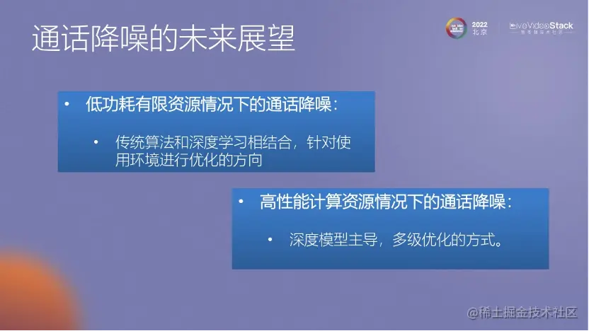 未来展望方面,对于手机通话降噪,我们可以考虑基于低复杂度和低功耗的要求。这意味着可以结合传统算法和深度学习技术。在高计算资源的情况下,深度学习模型可能会成为主要的选择,并采用多级优化的方式来提高性能和效果。