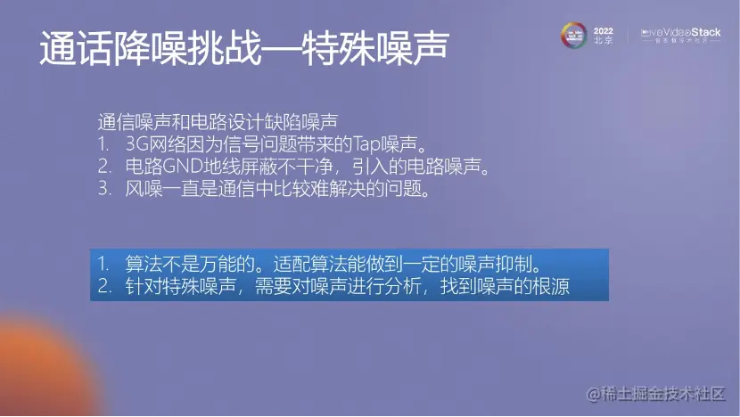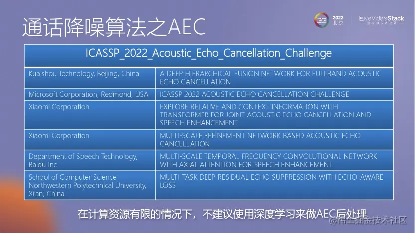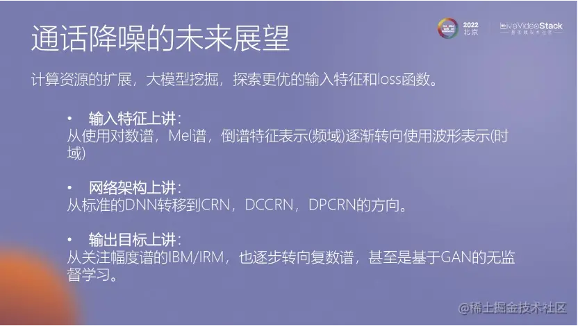 通话降噪其实还有很多问题,我简单罗列一下。例如强非线性情况下的一些问题、内麦回声的问题等,这都是需要解决的。