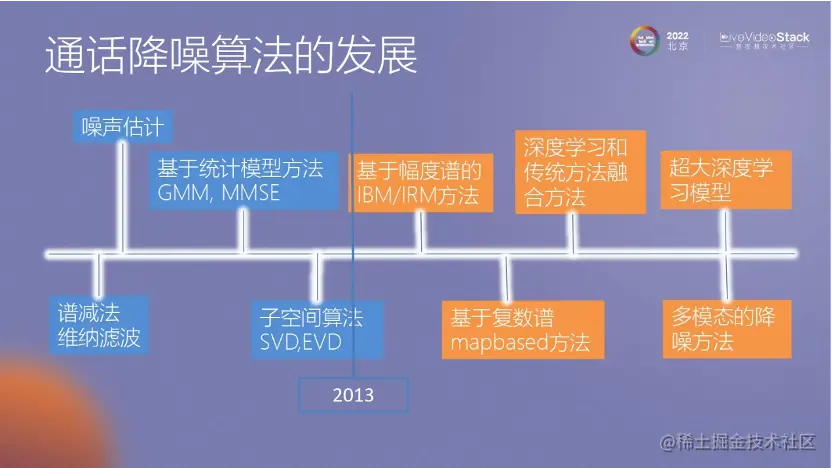 首先,我们来看一下通话降噪算法的发展过程。最早,大家可能都知道谱减法、噪声估计这些早期的算法,后来的数据处理中也会用到类似的方法,例如高斯混合模型(GMM)算法和子空间算法,目前我们也在使用矩阵分解方法,如IV。