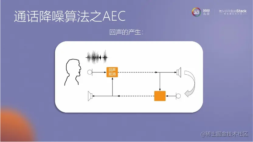 这里展示了回声产生的过程:有一个说话人发出声音,声音通过路径传播,如果在下方黄色框内没有用算法进行处理,声音会通过麦克风进入耳朵。