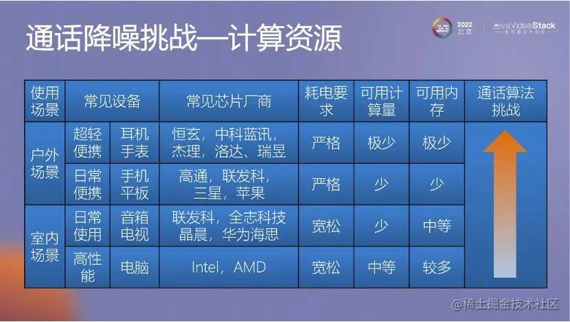 我们在手机、IOT以及在其他设备上的应用的时候,面临的最大问题就是计算资源。因为现在和以前不同,以前是传统算法,计算的容量有限。但是现在有深度学习这个模型。深度学习模型在语音降噪领域取得了显著的进展。这些模型的效果与模型的规模相关,越大的模型能够学习越多。如果想要实现更好的效果,关键是要确保足够的计算资源,所以这也依赖于硬件的不断发展。