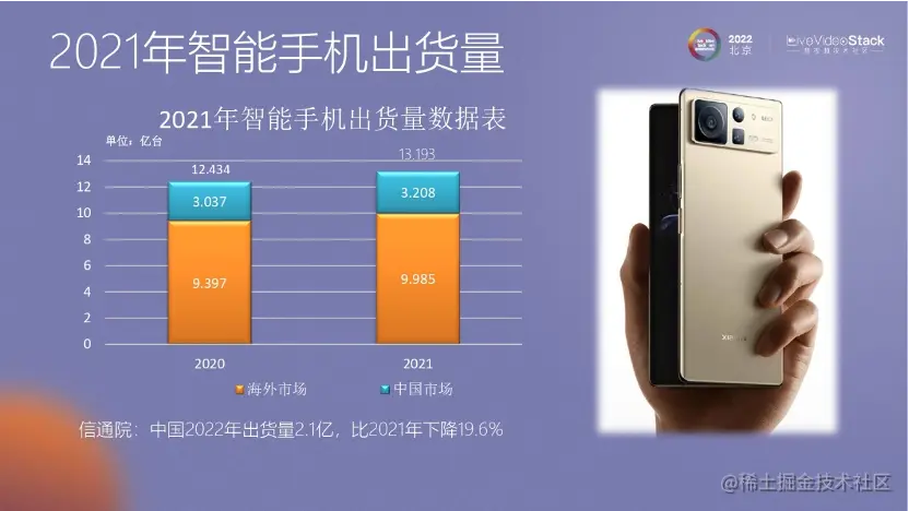 21年智能手机出货量的数据是13亿台,22年的数据量有所下降,大约在 11 亿台。