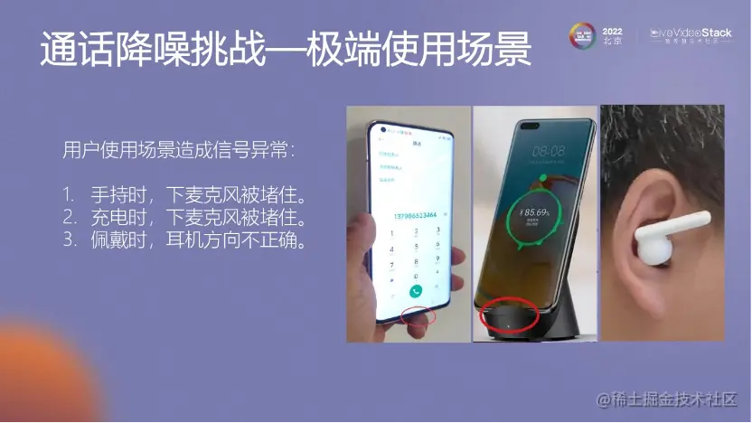 在实际应用中,我们面临一些问题。例如,无线充电器的使用,当手机放在无线充电器上并打免提电话时,充电器的底部可能会堵住麦克风。因此,这时需要算法智能性地解决这个问题。