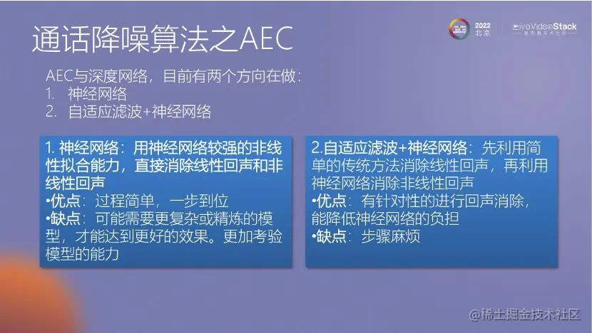 此外,关于AEC,现在也有使用神经网络的方法,它的优点是语音保真度更好。目前有两种方法,一种是让神经网络学习整个过程,将麦克风的数据和参考信号输入网络,让网络自己学习和处理回声抑制;另一种方法是将传统算法的结果和参考信号一起提供给神经网络进行处理。这两种方法都各有优势,但是神经网络的计算量非常大,与传统方法相比,计算量的问题让我们很难接受。