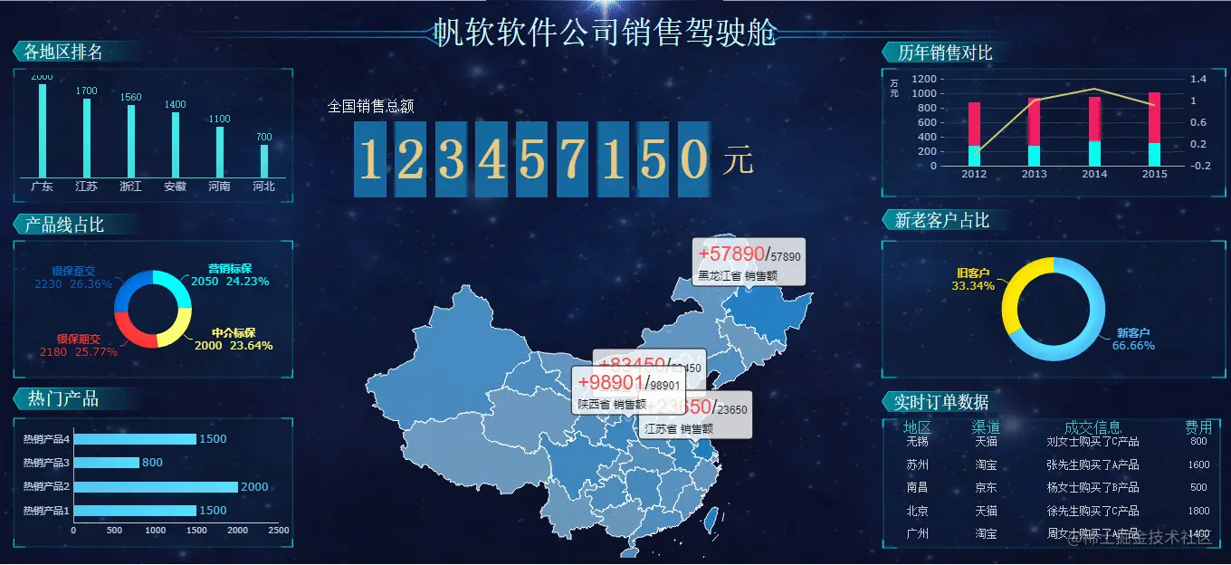 今天老陈去参加了一个数据分析方面的行业论坛,一位同行分享了下面这张大屏,各个地区的销售额排名、热门产品、历年情况等各种核心指标都整合在了一张大屏上,整张大屏还是动态的,点哪里亮哪里,看起来特别酷炫。作为一个老IT人,我太了解这张大屏背后,掉了多少程序员的头发,废了多少业务人员的嘴皮子。