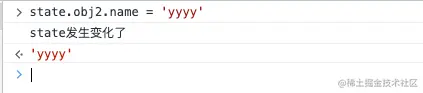 看来还是有不少坑啊!虽然我们实现了n层嵌套对象属性的读取(理论上所有的属性改变都应该触发回调),但是state.obj2.name = 'yyyy'却没有被感知到,为什么呢?