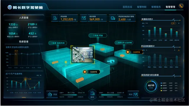 结合医院官方平面图,进行医院大楼的大屏建模,大屏两侧显示耗材情况、医院质量和安全指数、人员管理和院感管理系统。还配有多功能模块显示患者画像,分析患者情况和疾病现状,对患者人数进行预测,以便出现问题做出及时的反应。