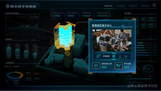 主屏展示:中间以医院大楼为主,显示当前医院的人员流动情况,左右两侧显示实时医疗状况。