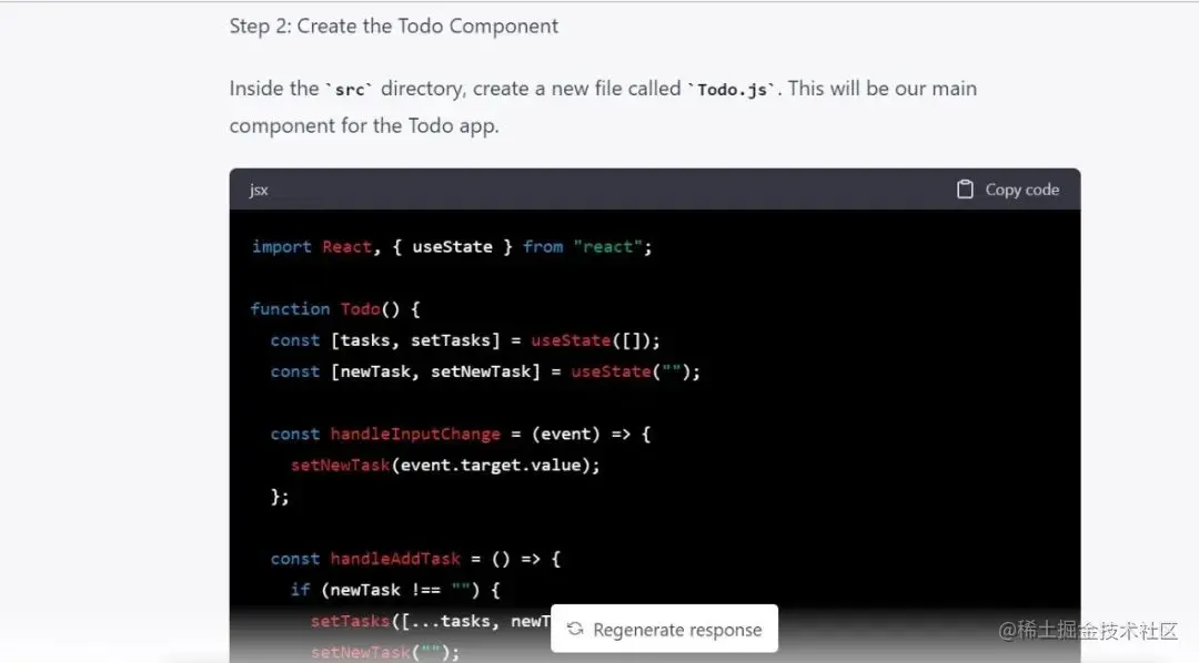 例如,让我们思考一个使用 JavaScript 构建的简单 Todo 应用程序的场景。在这种情况下,如果您想切换到 React(一种用于构建用户界面的流行 JavaScript 库),通常需要使用 React语法重写整个应用程序。然而,ChatGPT 可以简化这一过程,您可以轻松地过渡到 React,而无需编写任何代码。