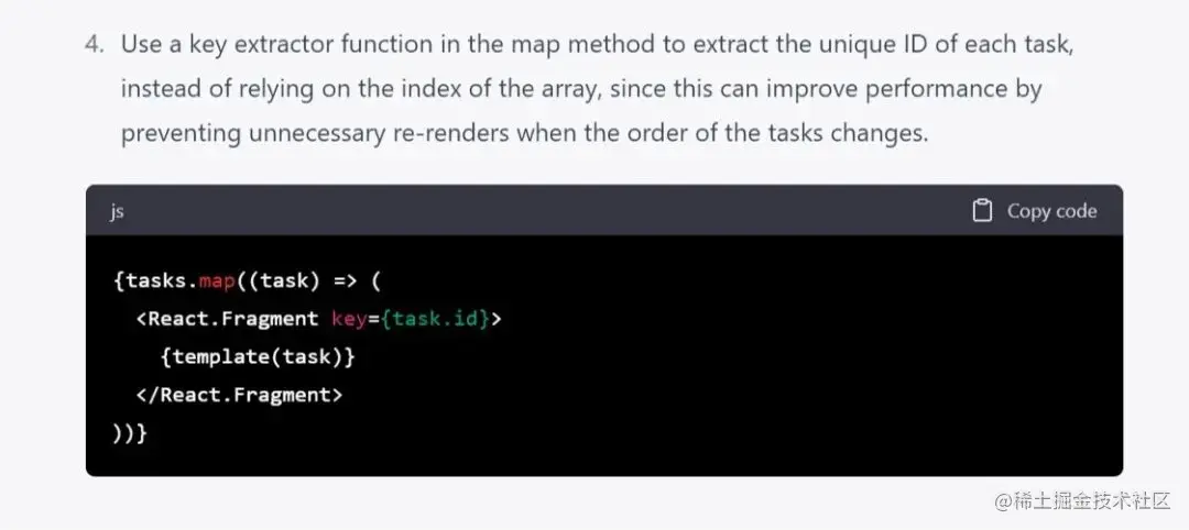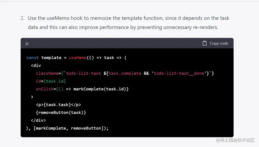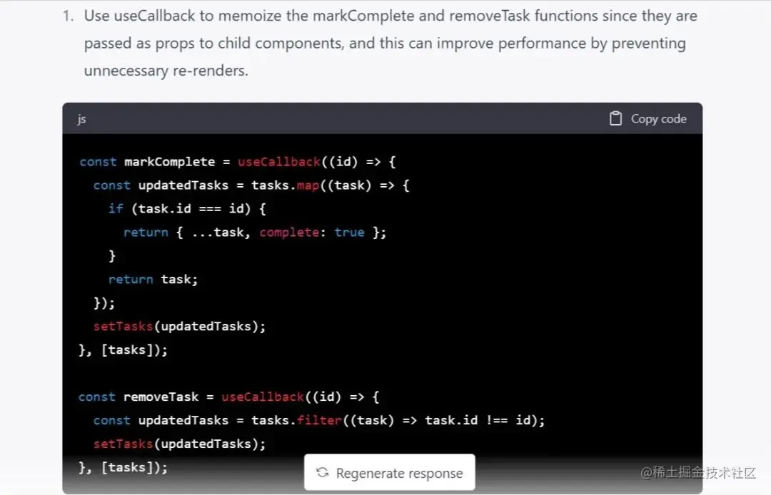 实例:在上一部分,我们要求 ChatGPT 帮助我们将普通 JavaScript 代码转换为 ReactJS。现在,我们试图优化这个应用程序,并寻求 ChatGPT 的帮助建议。下图显示了 ChatGPT 提供的建议,来帮助我们优化我们的应用程序。