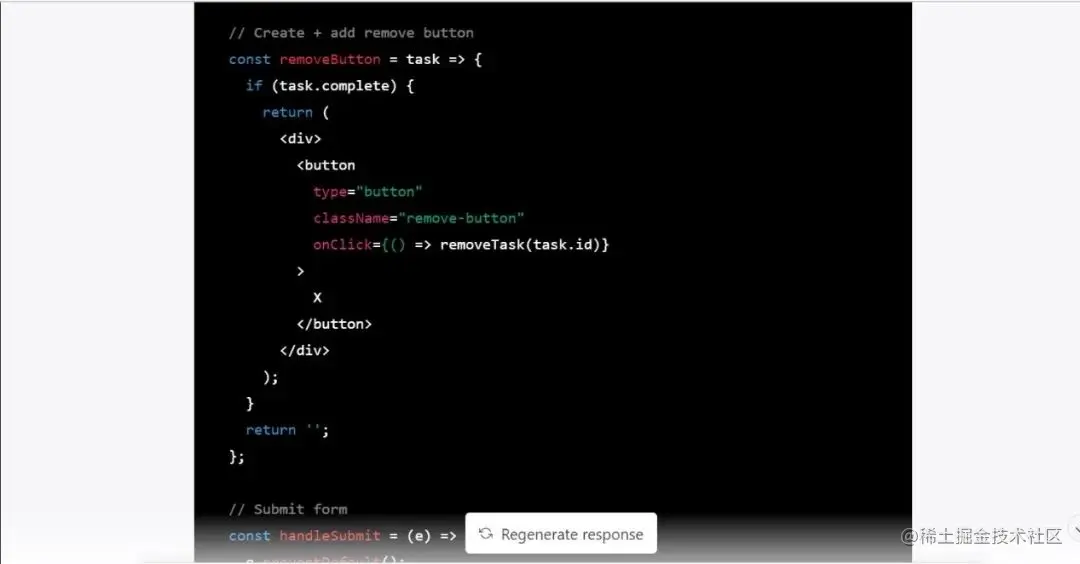 实例:我从这里有一个使用普通 javascript 构建的 Todo 应用程序,并且我提示 ChatGPT 在 React 中重写相同的代码,示例如下: