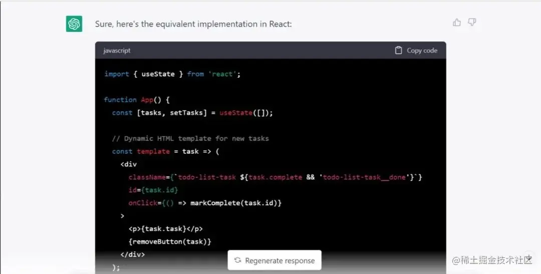 这是因为 ChatGPT 经过了大量编程语言语法库的训练,能够理解应用程序的底层逻辑。因此,它可以将现有的 JavaScript 代码翻译成 React 语法,从而促进平稳过渡。