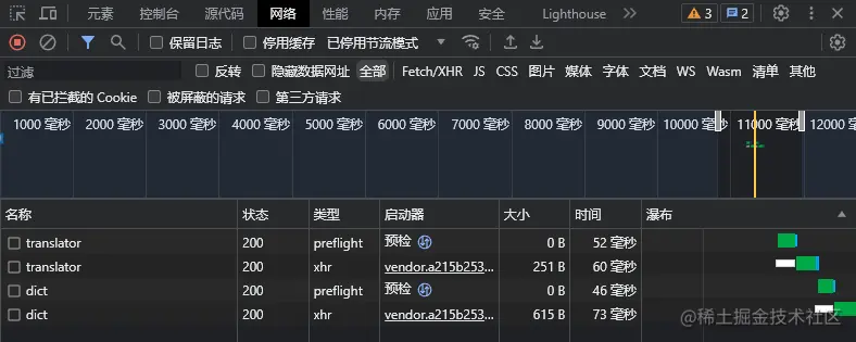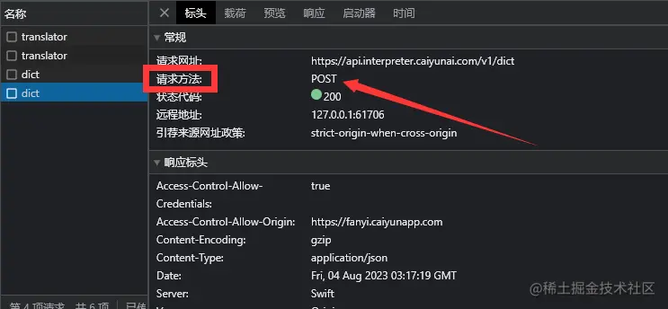 在图中我们发现了dict字样的请求,点开查看(注意:此处的请求方法应为POST,而不是OPTIONS,OPTIONS请求即为上文提到的预检请求)