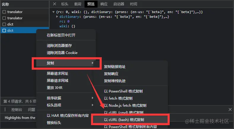 - 首先在浏览器检查工具中复制请求信息,右键dict请求: