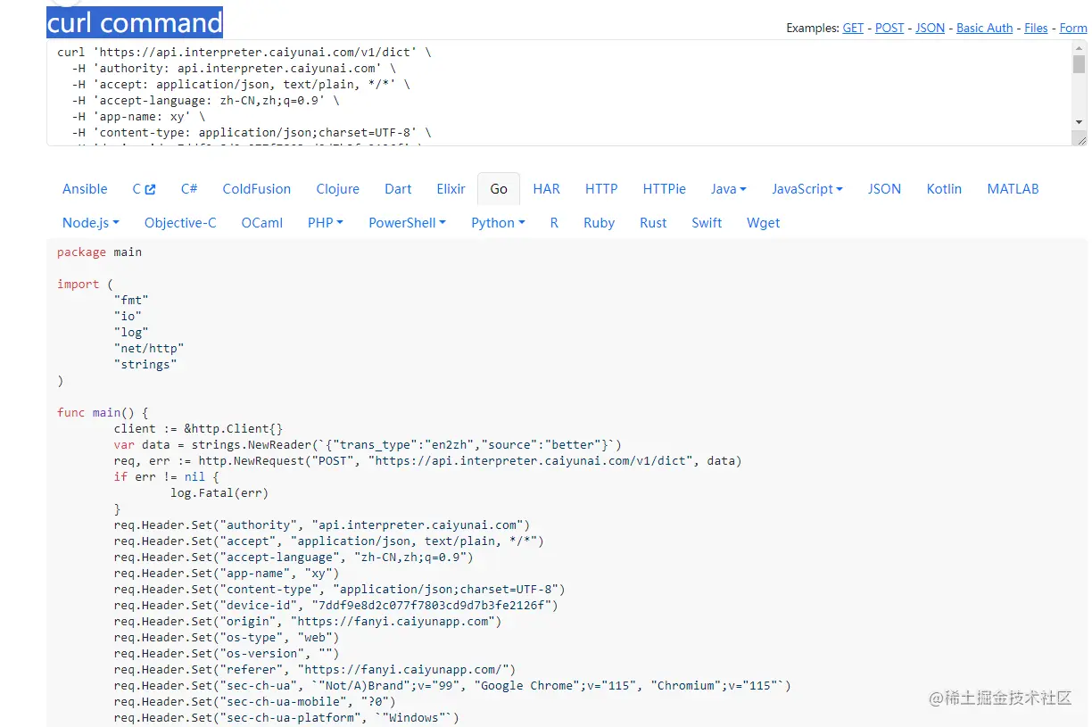 - 打开代码生成工具,粘贴至curl command框中,下方就会生成Go语言代码