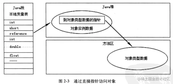 通过直接指针访问的方式中,reference中存储的就是对象在堆中的实际地址,在堆中存储的对象信息中包含了在方法区中的相应类型数据。这种方法最大的优势是速度快,在HotSpot虚拟机中用的就是这种方式。