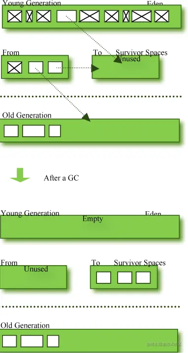 从上面的过程可以看出,Eden区是连续的空间,且Survivor总有一个为空。经过一次GC和复制,一个Survivor中保存着当前还活着的对象,而Eden区和另一个Survivor区的内容都不再需要了,可以直接清空,到下一次GC时,两个Survivor的角色再互换。因此,这种方式分配内存和清理内存的效率都极高,这种垃圾回收的方式就是著名的 “停止-复制(Stop-and-copy)”清理法(将Eden区和一个Survivor中仍然存活的对象拷贝到另一个Survivor中) ,这不代表着停止复制清理法很高效,其实,它也只在这种情况下高效,如果在老年代采用停止复制,则挺悲剧的。