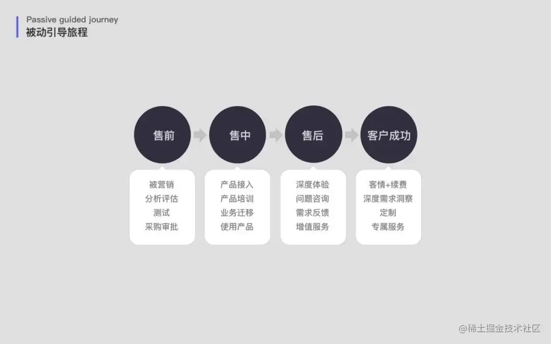这是典型的互联网工具类产品的成长旅程,其特点是产品体量相对较小、解决痛点更简单直接、使用门槛低且易上手、协同依赖性不高,这类产品往往服务于小B(个体从业者或为解决工作问题的个人),客单价低但用户群体大、公司决策相对感性高效,总之正好和被动引导旅程特点相反;
