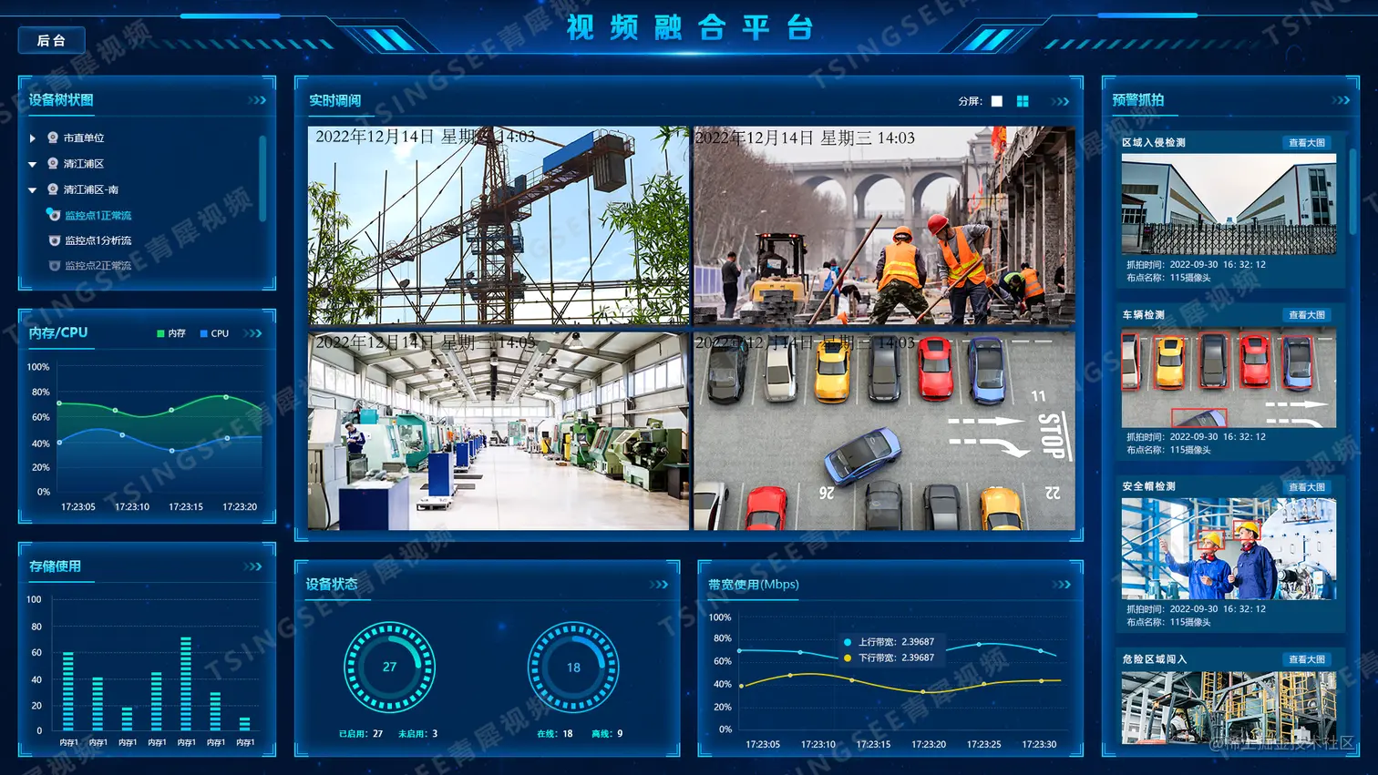 安防视频汇聚EasyCVR云平台支持海量视频的轻量化接入与汇聚管理,能在复杂的网络环境中,将分散的各类视频资源进行统一汇聚、整合、集中管理,实现安防视频资源的鉴权管理、按需调阅、全网分发、智能分析等。EasyCVR视频汇聚能力+智能分析网关的AI分析能力,基于多种AI深度学习算法模型,可支持人脸、人体、车辆、物体、行为等检测识别能力,并能实现抓拍、比对、告警、分发等视频能力服务,可应用在工地、工厂、煤矿、餐饮、消防、电力、社区、校园、园区等领域中。