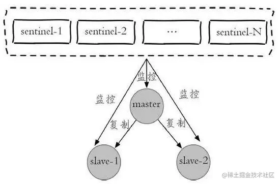 每个 sentinel 节点其实就是一个redis实例,与主从节点不同的是 sentinel 节点作用是用于监控redis数据节点的,而 sentinel 节点集合则表示监控一组主从redis实例多个 sentinel 监控节点的集合,比如有主节点 master 和从节点 slave-1 、 slave-2 ,为了监控这三个主从节点,这里配置N个 sentinel 节点 sentinel-1 , sentinel-2 , ... , sentinel-N 。如下图是 sentinel 监控主从节点的示例图: