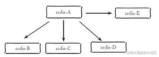 主从模式很好的解决了数据备份问题,并且由于主从服务数据几乎是一致的,因而可以将写入数据的命令发送给主机执行,而读取数据的命令发送给不同的从机执行,从而达到读写分离的目的。如下所示主机 redis-A 分别有 redis-B 、 redis-C 、 redis-D 、 redis-E 四个从机: