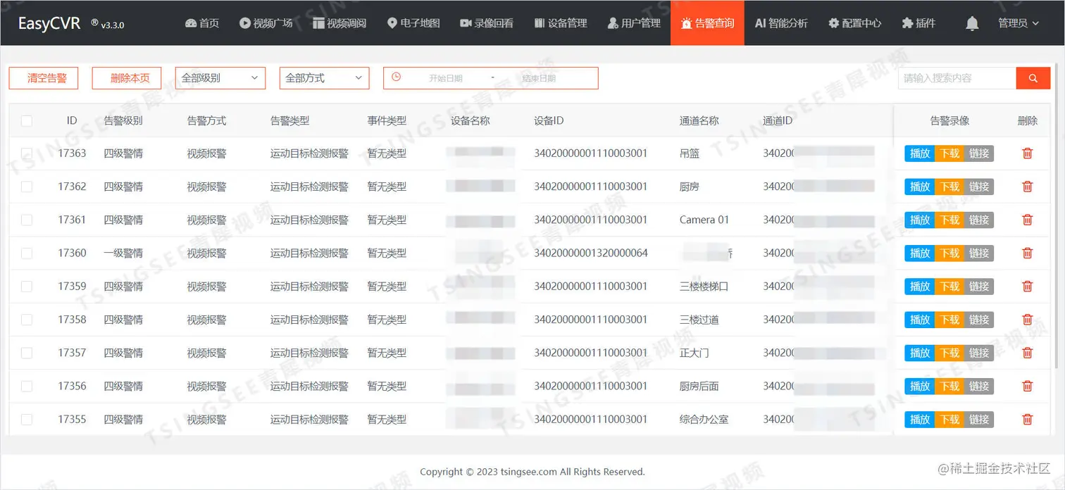 TSINGSEE青犀视频监控综合管理平台EasyCVR基于云边端协同,可支持海量视频的轻量化接入与汇聚管理。平台既具备传统安防视频监控的能力,比如:视频监控直播、云端录像、云存储、录像检索与回看、告警上报、平台级联、云台控制、语音对讲等,也能接入AI智能分析的能力,包括人脸检测、车辆检测、烟火检测、安全帽检测、区域入侵检测等。