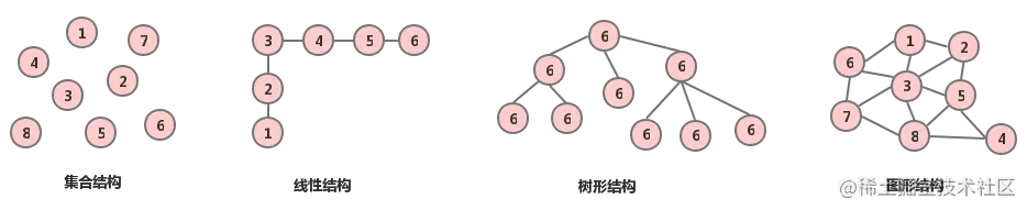 ① 集合结构:数据元素之间的唯一关系就是属于同一个集合