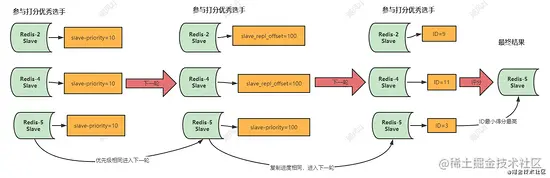 接下来进行打分,主要会分三个阶段:分别从 从库的优先级、复制进度、ID大小来进行打分。