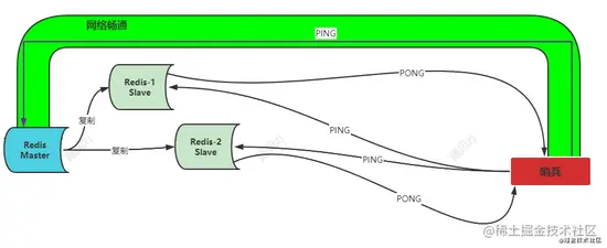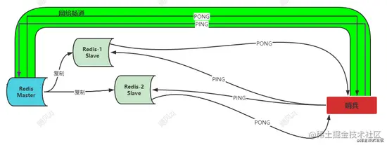 哨兵主要是监听主库和从库是否存活,怎么进行监控? 哨兵会定期的给从库发送PING命令,如果从库没有在设定的时间内回复哨兵,那么就会认为从库下线了。哨兵也会定期的给主库发送PING命令进行通信,如果主库也没有在设定的时间内回复哨兵,那么就会认为主库也“下线了”。【注意我这里只是为了说明下监控的方式,真正判断的主库下线不是这样的】。