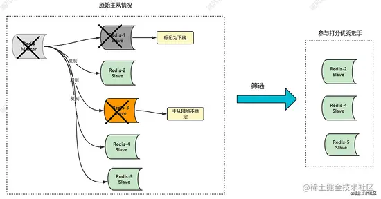 哨兵在进行打分之前,先会在从库进行筛选,把不合格的从库筛选掉,留下优秀的种子选手来进行参赛打分。