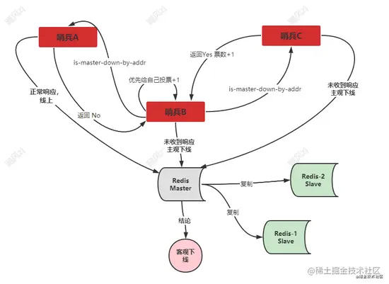 这个图只是简单地为了说明,哨兵B和哨兵C都发现了redis Master 为主观下线了,但是哨兵B 优先给其他哨兵发了 is-master-down-by-addr 命令,并得到了哨兵C的回复,那么加上自己给自己的投票,那么就是得票数为2 ,大于等于 quorum的配置值 2,此时主库标记为客观下线.